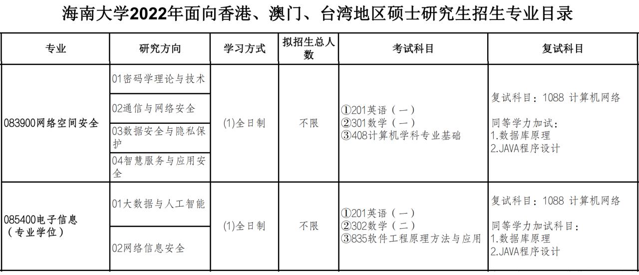 详细信息请参考本页面“海南大学 2022 年面向香港、澳门、台湾地区 招收博士、硕士研究生简章”和“【参考书目】海南大学 2022 年面向香港、澳门、台湾地区招收硕士学位研究生”
