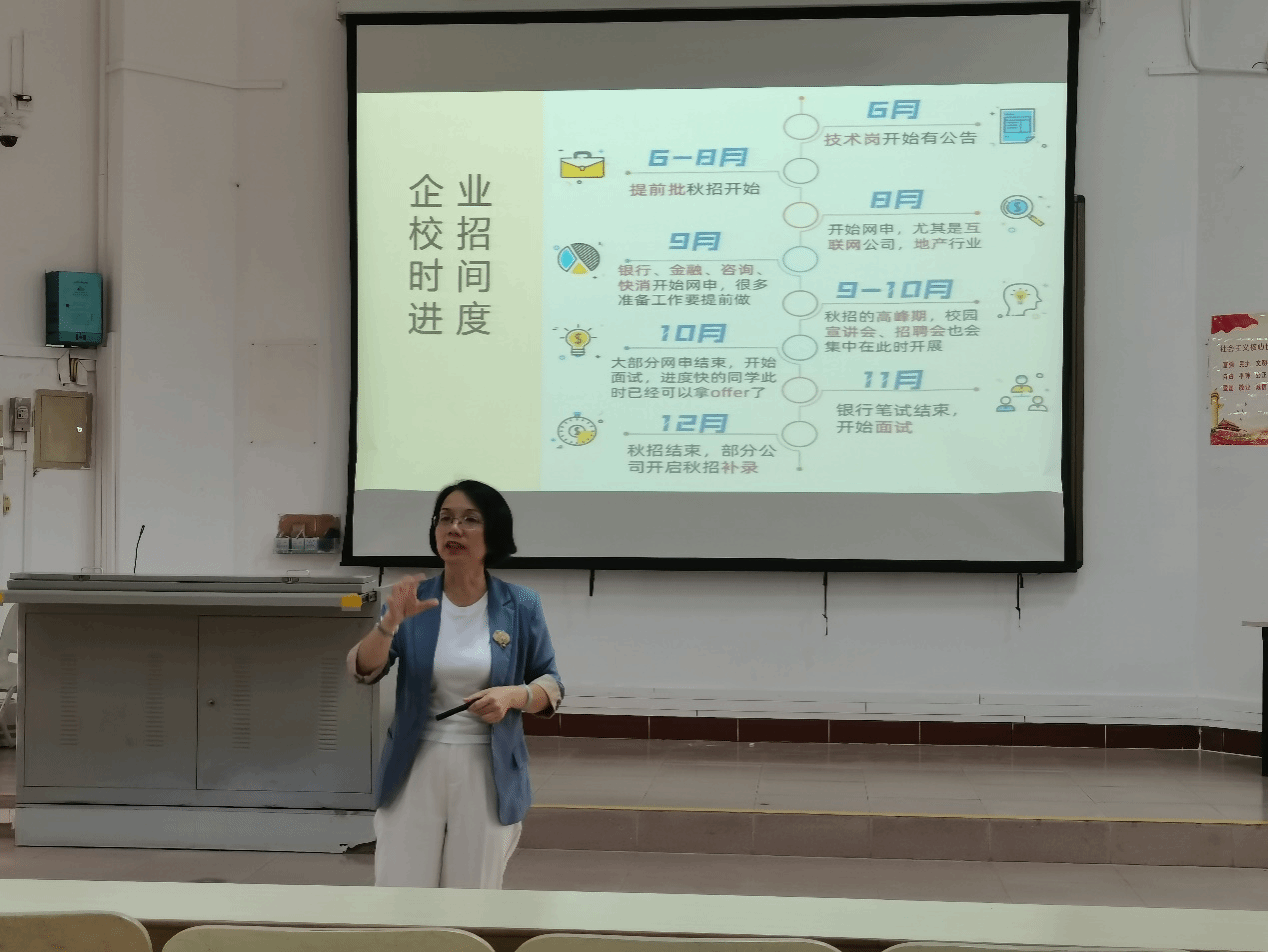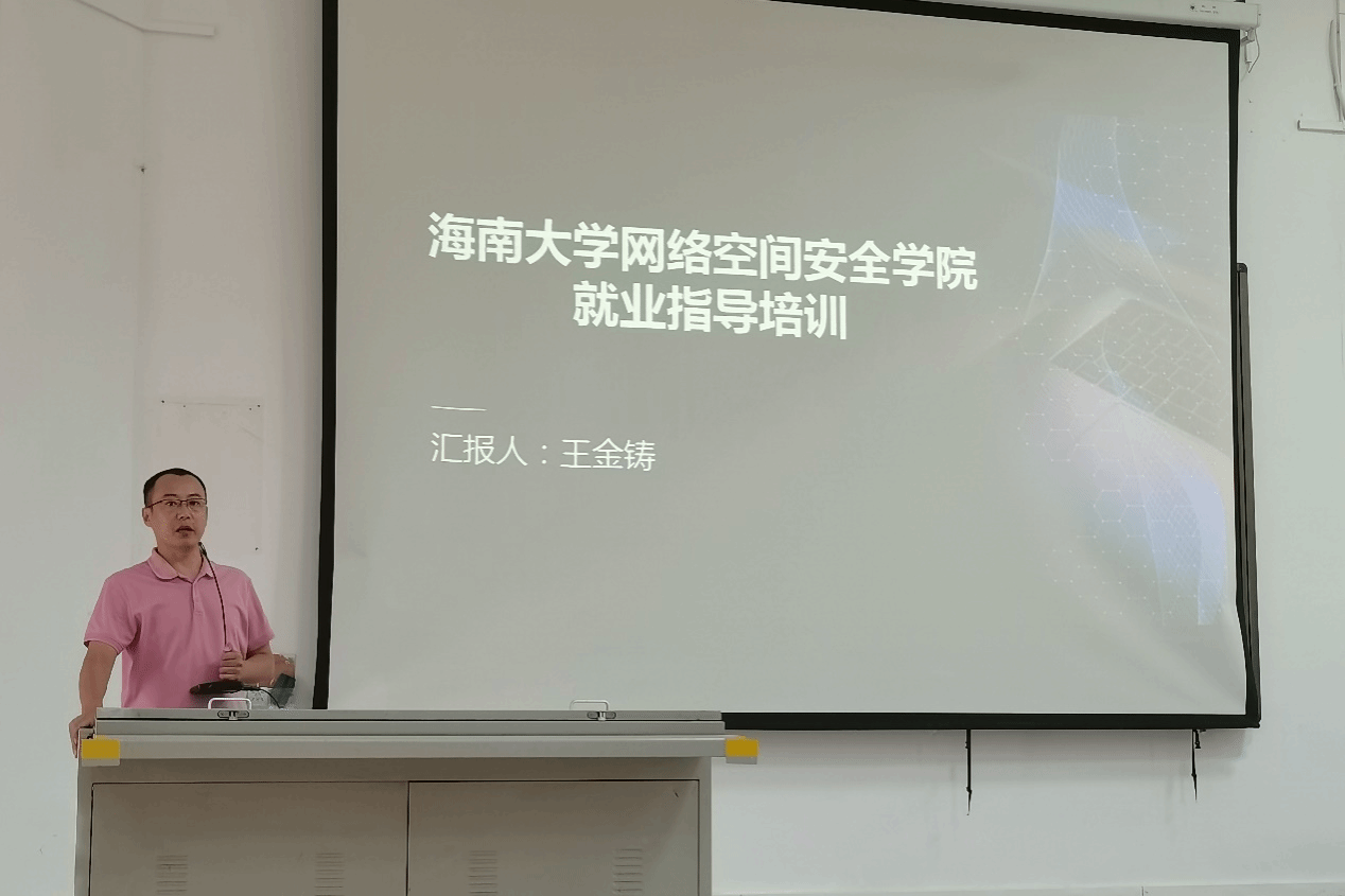 动员会最后,由企业代表王金铸老师和就业指导专家林英燕讲师开展就业专题讲座。王老师为学生剖析了网络安全的专业定位,行业总体情况,并从企业角度介绍了网安人才评价标准体系,指导学生为就业做好准备。林老师为学生介绍了用人单位招聘进度表,讲解了面试技巧,从企业面试官的角度剖析了面试官的需求和喜好,并指导学生如何面对各种面试问题。