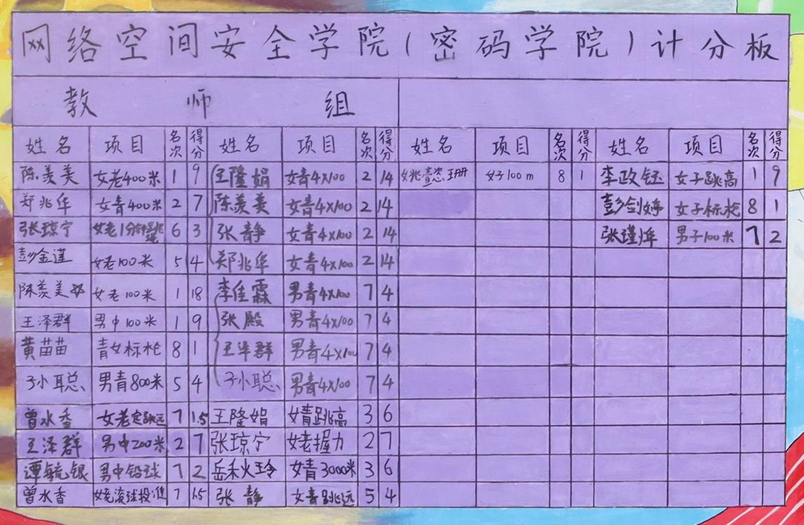 我院师生在此次校运会上表现突出。我院现有在岗教职工44人,参赛人数24人,过半教职工参与进来,将竞技赛场上拼搏的精神发扬的淋漓尽致。陈羡美老师宝刀未老,在赛场上大放异彩。她不仅在女子老年400米项目中夺得第一,并在女子老年100米项目中打破了校记录,斩获冠军。由陈羡美、王隆娟、郑兆华、张静组成的女子接力队在女子4*100米项目上夺得亚军,与冠军仅差0.19秒!男子教工组4*100米项目也获得第七的好成绩。我院王泽群老师实力也不可小觑,摘得男子中年100米项目的桂冠,并在男子中年200米项目中取得亚军。同时,我院师生在其他项目中也大放异彩。教师组的高水平发挥使我院夺得教职工组团体第五名、教职工组女子团体第六名的喜人成绩。学生组同样有出色的表现,其中李政钰同学在女子跳高项目中脱颖而出,一举夺冠。