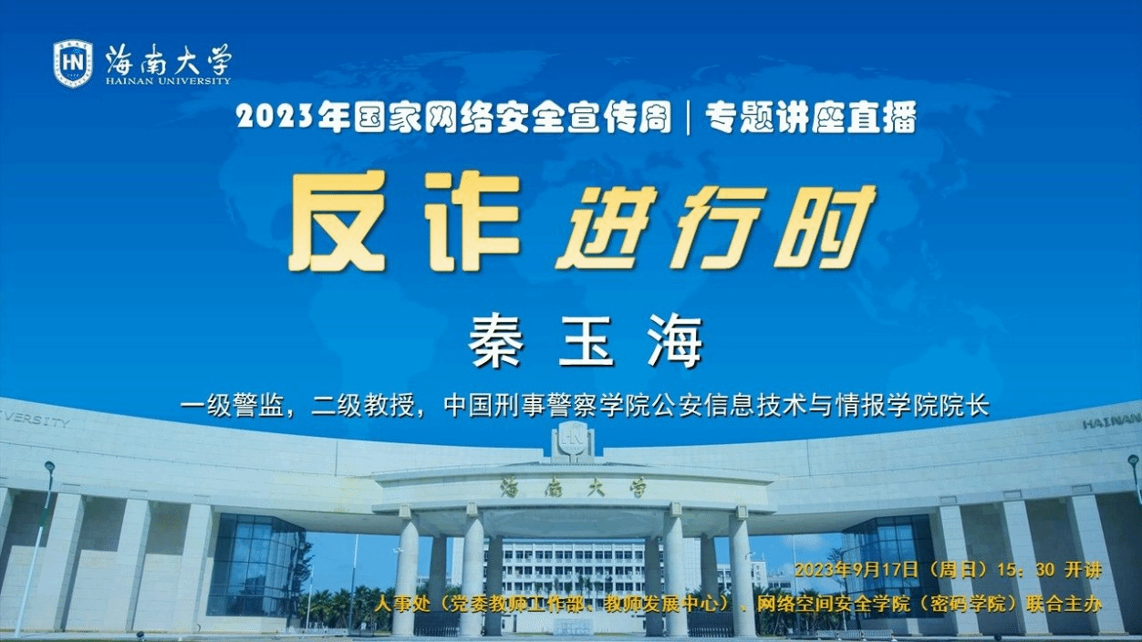 9月17日,我院和学校人事处联合主办了“反诈进行时”专题讲座,本次特邀主讲专家为中国刑事警察学院秦玉海教授,全校共千余名师生参加。