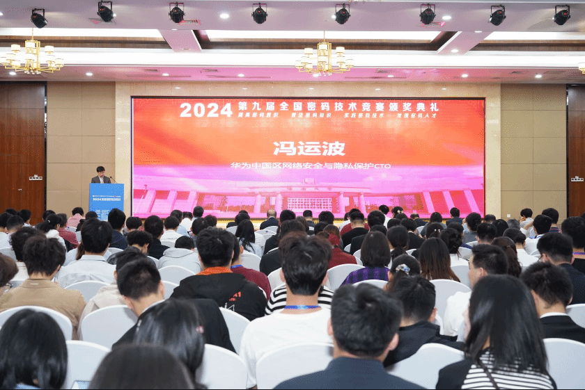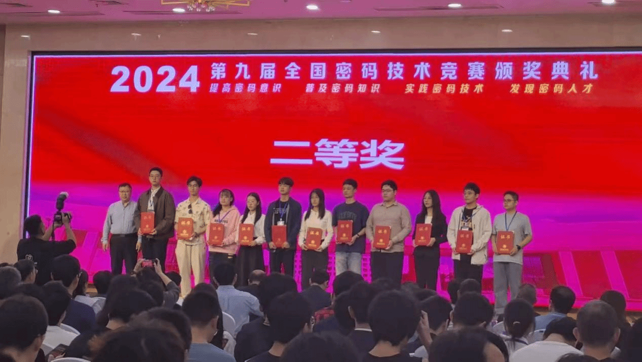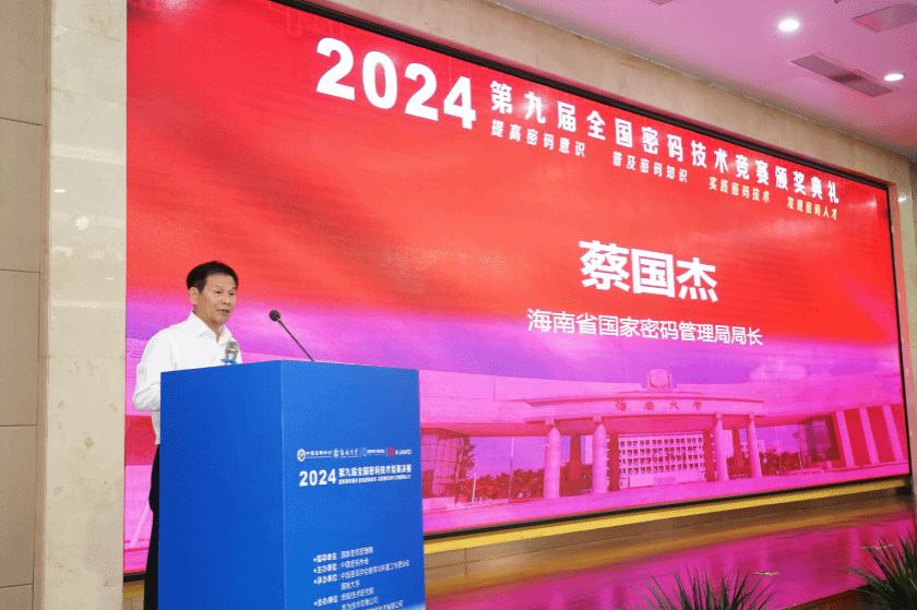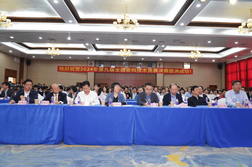 11月28日-30日,2024第九届全国密码技术竞赛决赛在海南大学顺利举办,中国密码学会理事长、中国科学院院士王小云,中国密码学会副理事长、秘书长安晓龙,海南省国家密码管理局局长蔡国杰,海南大学党委常委、副校长刘谦,中国密码学会副理事长戚文峰,中国密码学会副理事长谷大武,中国密码学会副秘书长王瑶,海南大学密码学院院长曹春杰、书记陈广锐,华为中国区网络安全与隐私保护CTO冯运波出席颁奖典礼。